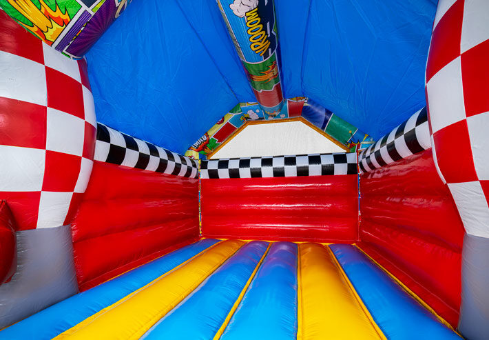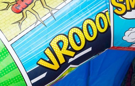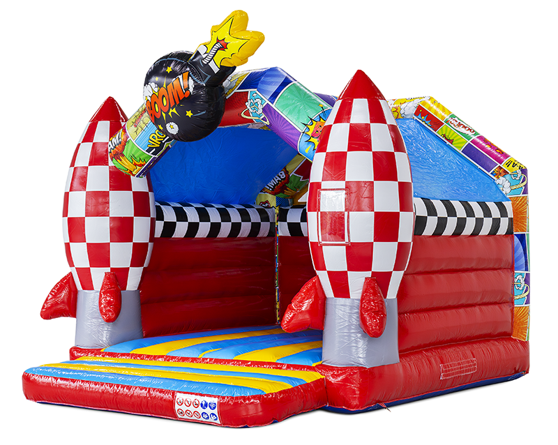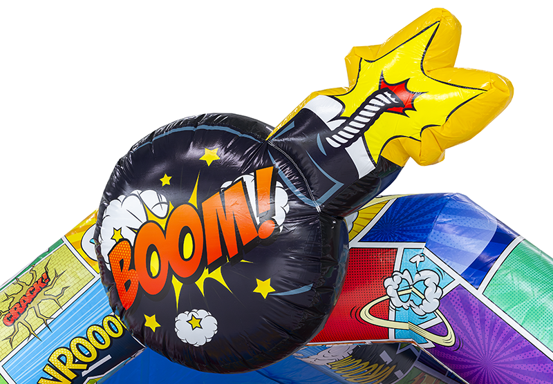 Wil je een kinderfeestje, buurtfeest of familiedag onvergetelijk maken? Het Comic Springkussen met A-frame is een echte blikvanger! Met zijn kleurrijke stripfiguren en twee grote 3D-raketten bij de ingang stappen kinderen in hun eigen superheldenavontuur.